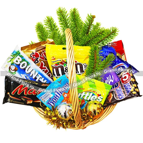 Корзина "Стандартная" (на фото): Печенье Orion Choco-Pie - 1 уп., упаковка Mars  (6 батончиков) - 1 уп., упаковка Snickers (6 батончиков) - 1 уп., упаковка Bounty (6 батончиков) - 1 уп., упаковка Twix (6 батончиков) - уп., упаковка Milky Way (6 батончиков) -  1 шт., M&M's - 1 шт., Skittles - 1 шт., Бон пари - 1 шт., шоколадка milka  - 1 шт., елочные игрушки - 3 шт, новогодний декор, корзина средняя.