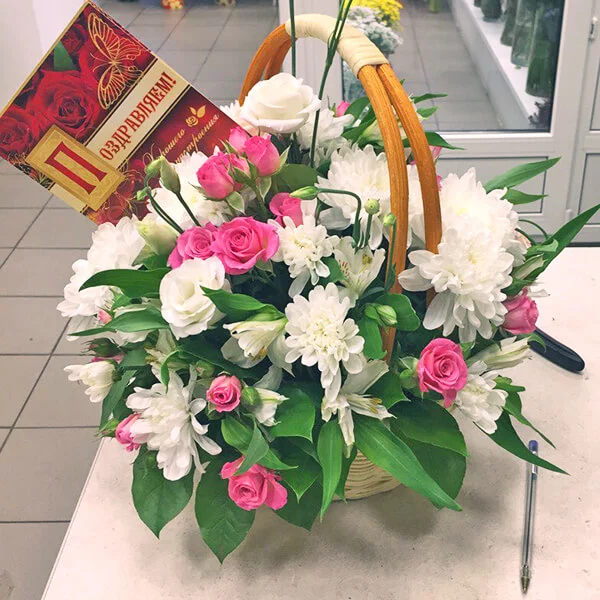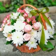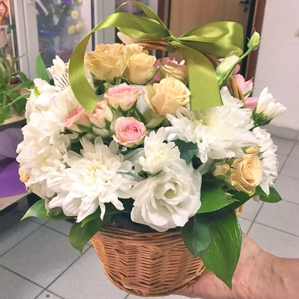 Уменьшенная: хризантема кустовая белая - 2 шт., роза кустовая белая - 1 шт., роза кустовая розовая - 1 шт., эустома белая - 1 шт., альстромерия белая - 2 шт., декоративная зелень, оазис, корзина малая.