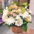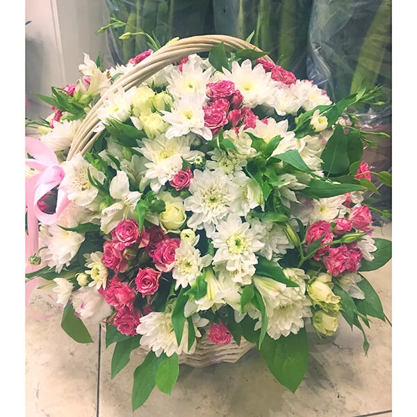 ЛЮКС: хризантема кустовая белая - 5 шт., роза кустовая белая - 4 шт., роза кустовая розовая - 5 шт., эустома белая - 3 шт., альстромерия белая - 5 шт., декоративная зелень, оазис, корзина средняя.