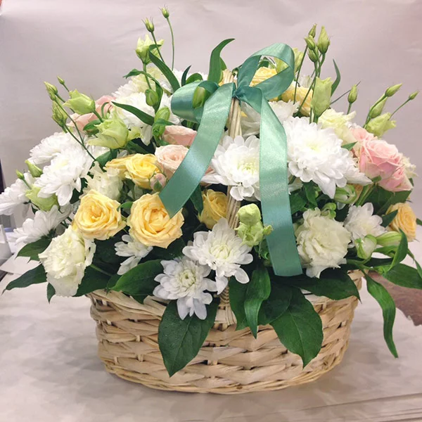 Стандартная (на фото): хризантема кустовая белая - 2 шт., роза кустовая белая - 2 шт., роза кустовая розовая - 3 шт., эустома белая - 1 шт., альстромерия белая - 3 шт., декоративная зелень, оазис, корзина средняя.
