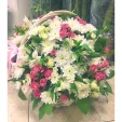 Сочетание ангельски нежных белых и розовых кустовых роз и эустомы в композиции с белыми хризантемами, альстромерией и декоративной зеленью подчеркнет Ваш изысканный вкус.