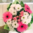 (на фото) гербера розовая - 3 шт, хризантема кустовая ромашковая - 3 шт, роза кустовая розовая - 1 шт, рускус, упаковка, лента. Примерный диаметр букета 30х30 см.