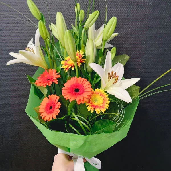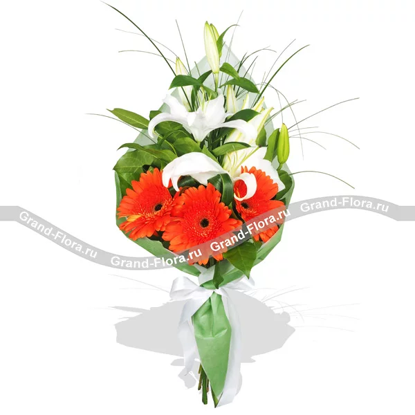 ЛЮКС: лилия белая - 3 шт., гербера орнажевая - 5 шт., берграс, салал, фетр зеленый.