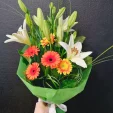 Уменьшенный: лилия белая - 1 шт., гербера орнажевая - 2 шт., берграс, салал, фетр зеленый.
