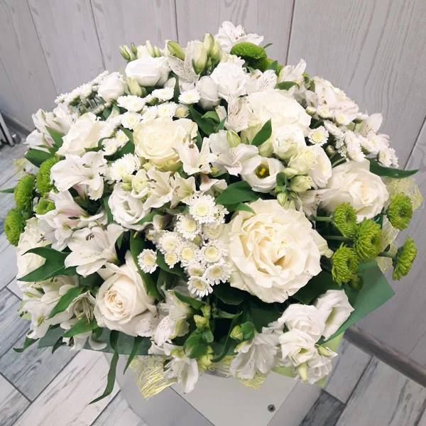 ЛЮКС: роза белая - 9 шт., эустома белая - 5 шт., альстромерия белая - 9 шт., хризантема кустовая зеленая - 7 шт., фетр зеленый.