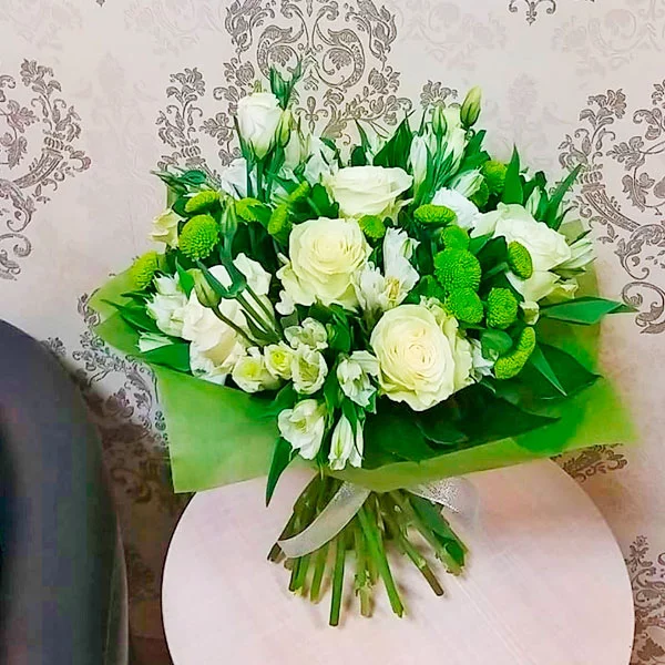 ДЕЛЮКС: роза белая - 15 шт., эустома белая - 10 шт., альстромерия белая - 11 шт., хризантема кустовая зеленая - 11 шт., фетр зеленый.