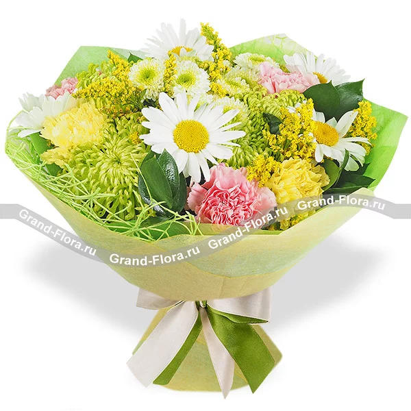 Стандартный (на фото): ромашка белая - 5 шт, хризантема одноголовая зеленая - 5 шт, хризантема кустовая белая (сантини) - 1 шт, гвоздика розовая одноголовая - 4 шт, солидаго - 2 шт,рускус, фетр зеленый, сетка зеленая.