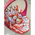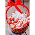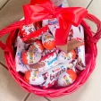 Уменьшенный: Kinder Сюрприз (яйцо) - 5 шт., Kinder Bueno - 3 шт., Kinder chocolate (шоколад молочный в упаковке) - 8 шт., Kinder chocolate со злаками - 3 шт., kinder schoko bons - (125г) 1 уп., корзина малая, лента красная, бант красный.