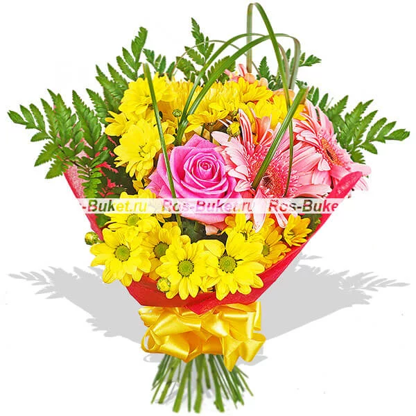 Стандартный (на фото): роза розовая (в центре) - 1 шт, гербера розовая - 3 шт, хризантема кустовая желтая - 2 шт, хризантема одноголовая желтая - 1 шт, папаратник - 3 шт, берграс, фетр розовый, бант желтый.