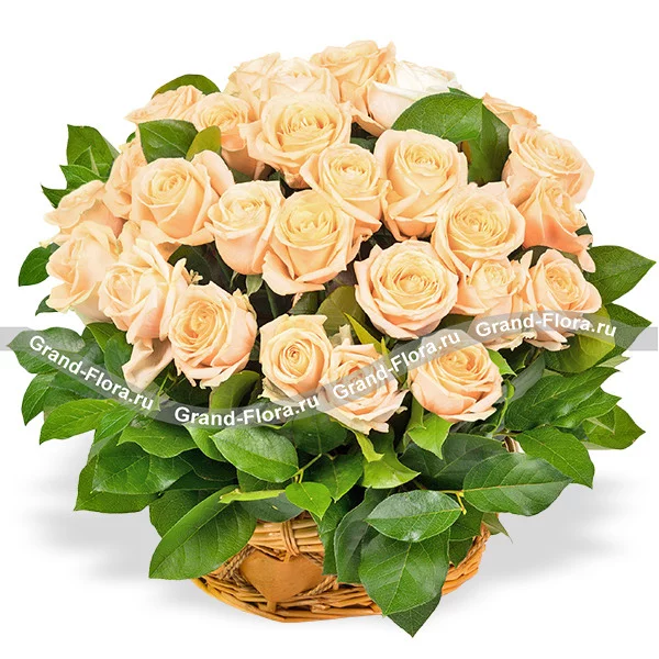 Роза кремовая - 51 шт., рускус - 6 шт., оазис, корзина.