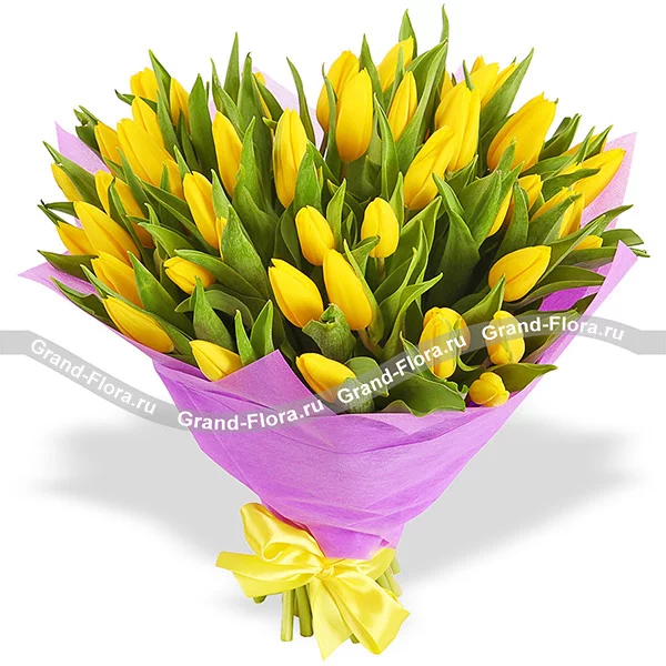 Тюльпан – это нежный и хрупкий цветок, который способен покорить своей красотой даже самое неприступное и ледяное сердце. А огромный букет желтых тюльпанов может стать для вас началом примирения с любимой девушкой или зажжет страсть в глазах сотрудницы, которая вам давно симпатична.rnНе стоит думать, что желтые тюльпаны являются предвестниками чего-то плохого, ведь эти солнечные бутоны могут поднять настроение и внести позитив в серые холодные будни. Но только при условии, что вы закажите букет из тюльпанов с доставкой уже сегодня.rnЗаказывая цветы в службе доставки цветов Grand-flora, вы можете быть уверены, что ваш любимый человек получит самые свежие и ароматные бутоны.