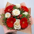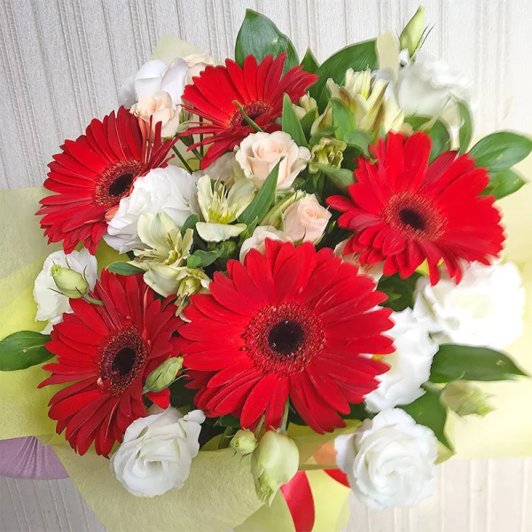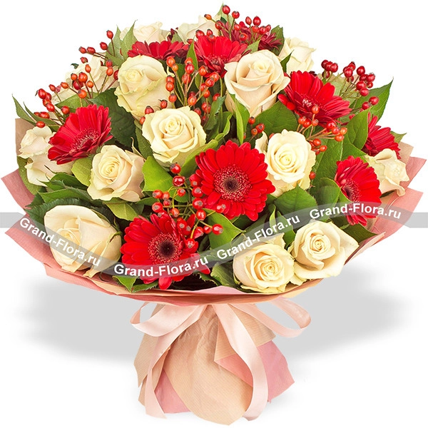 Невероятно-женственный букет создан стать подарком пленительнице вашего сердца. Утончённые белые розы и красные герберы воплотились в цветочную поэму, способную рассказать о ваших самых сокровенных чувствах!