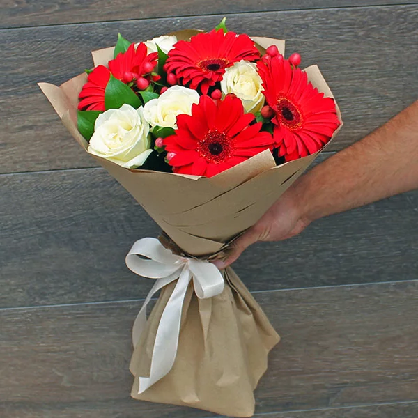 Стандартный: роза белая - 5 шт, гербера красная - 4 шт., гиперикум, декоративная зелень, упаковка крафт., лента., Примерный размер: 25Х25 см.