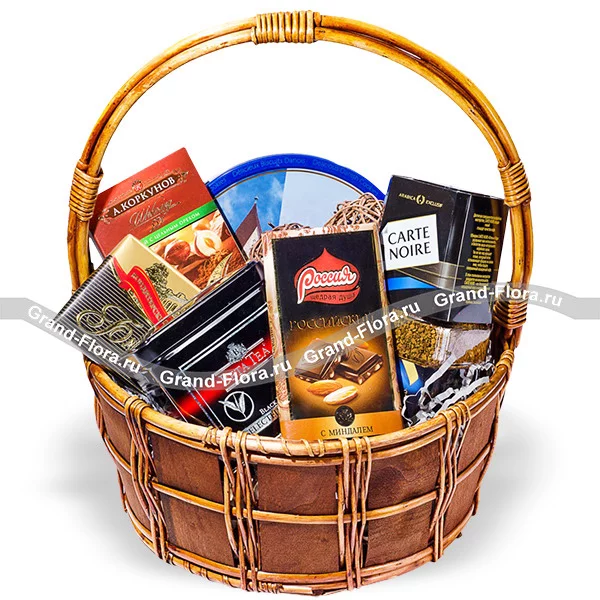 Стандартный: шоколад "Коркунов" - 1 шт., шоколад "Россия" - 1 шт., шоколад "Бабаевский" - 1 шт., кофе "Carte Noire" - 95 г., чай "Beta Tea" - 100 г., печенье в железной коробке 200гр, декор, корзина. ( при отсутствии корзины нужного размера, возможна замена на декоративный ящик)
