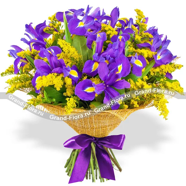 Стандартный: ирисы - 17 шт., солидаго - 4 шт., декоративная зелень, упаковка, лента.