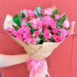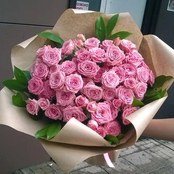 (на фото) роза кустовая розовая - 15 шт, упаковка, лента розовая. Примерный размер: 35Х35 см.