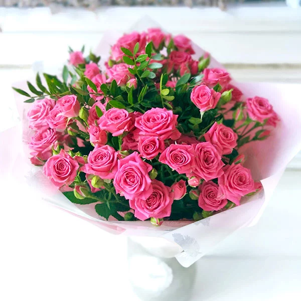Букет с розовыми кустовыми розами нежного оттенка выглядит очень романтично и женственно. Представьте себе нежные, едва раскрывшиеся бутоны, окрашенные в мягкие, приглушённые тона розового. Каждый стебель украшен множеством маленьких цветков, создающих иллюзию пушистого облака. Такой букет идеально подойдёт для подарка любимой женщине, подругам или коллегам, ведь он передаёт атмосферу лёгкости, теплоты и заботы.