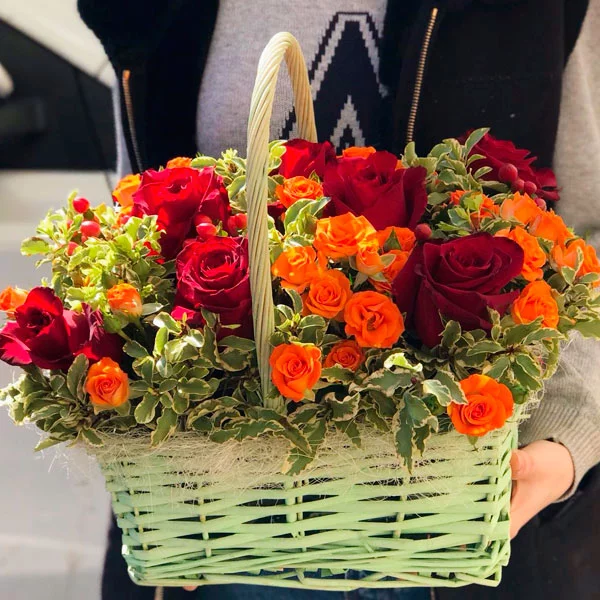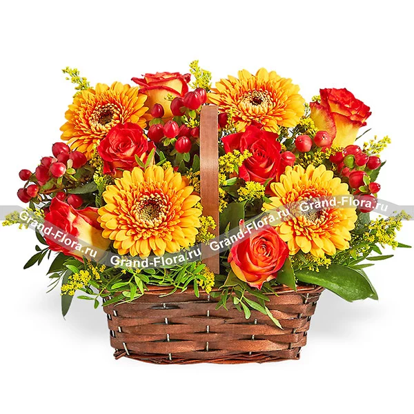 Легенды осени – корзина из оранжевых роз и гербер