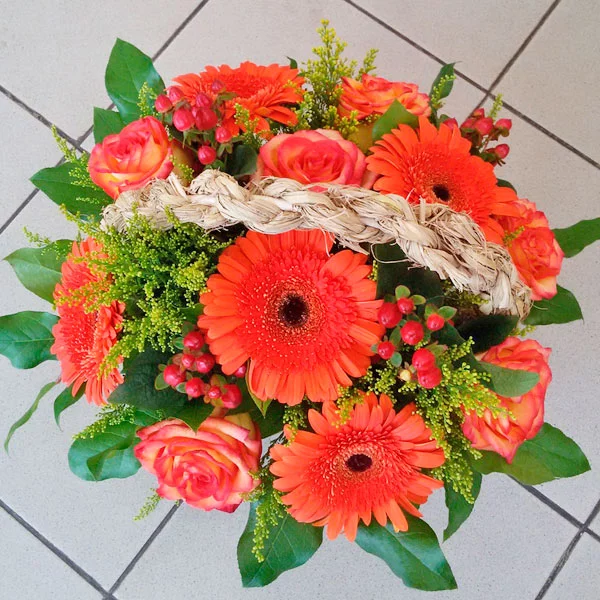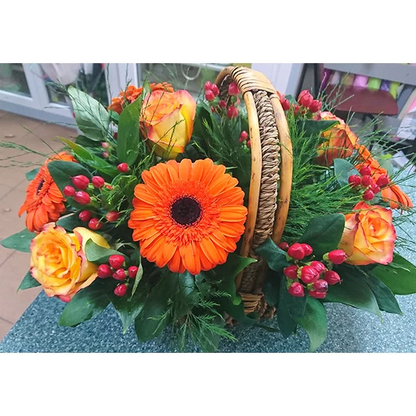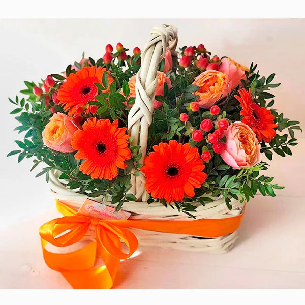 Уменьшенный: роза оранжевая - 3 шт., гербера оранжевая - 4 шт., гиперикум - 2 шт., декоративная зелень, оазис, корзина малая.
