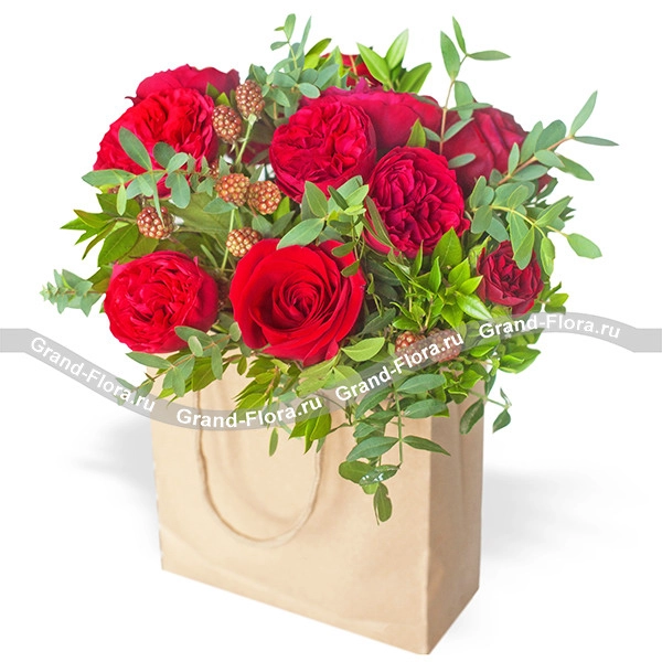 Стандартный: розы красные - 4 шт., пионовидные красные розы - 7 шт., рубус, декоративная зелень, пакет.