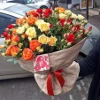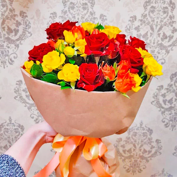 (на фото) роза кустовая оранжевая - 8 шт., роза кустовая красная - 8 шт., роза кустовая желтая - 9 шт., упаковка, лента. Примерный размер: 45Х45 см.