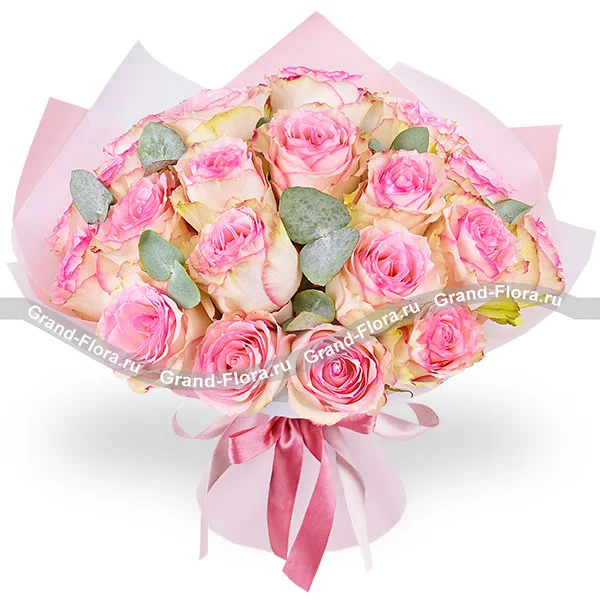 25 роз: роза розовая - 25 шт., эвкалипт - 7 шт., упаковка, лента.