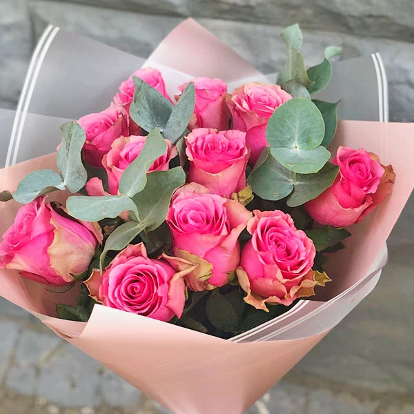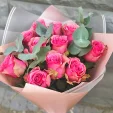 11 роз: роза розовая - 11 шт., эвкалипт - 3 шт., упаковка, лента.
