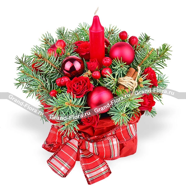 Стандартный: кустовые розы красные - 3 шт., ель, гиперикум красный  - 3 шт., новогодний декор, свеча - 1 шт., оазис, упаковка.