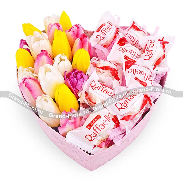 Букет составлен из разноцветных тюльпанов, на оазисе, в коробке в форме сердца, а так же с использованием конфет Raffaello, изящно вписанных в композицию и добавляющим ей шарма и презентабельности. Размер композиции от 25 см до 35 см, в зависимости от выбранного Вами варианта. Обращаем Ваше внимание, что состав и оформление композиции может отличаться.