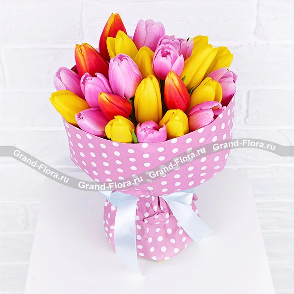 25 тюльпанов: разноцветные тюльпаны (оранжевые, розовые, желтые) - 25 шт., упаковка, лента.