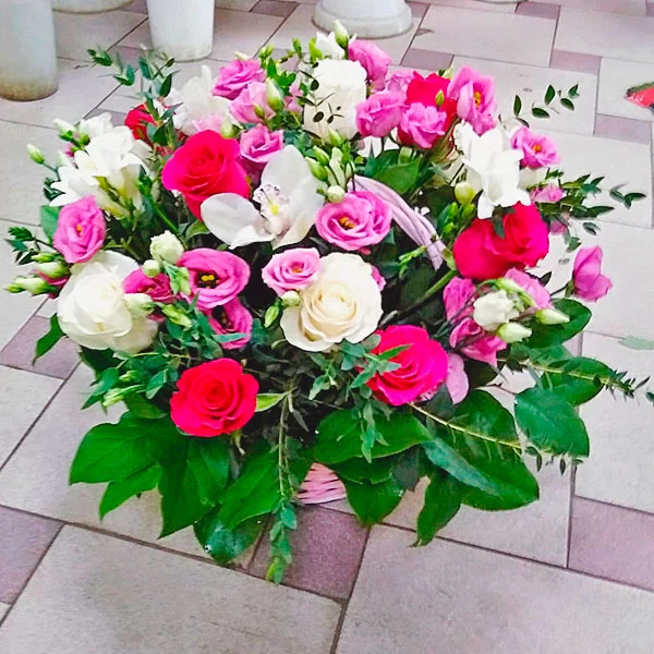 Корзина наполнена прекрасными белыми розами, символами невинности и чистоты намерений, нежными розовыми тюльпанами и эустомой того же оттенка, как символ созидания прекрасного, довершает копмозицию роскошная орхидея.  Диаметр от 20 см, до 35см, в зависимости от выбранного Вами варианта композиции. Обращаем Ваше внимание, что состав и оформление могут отличаться.
