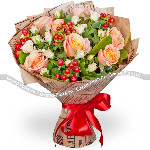 Уменьшенный: роза персиковая - 3 шт., роза кустовая белая - 2 шт., гиперикум красный - 4 шт., декоративная зелень, упаковка крафт, лента.