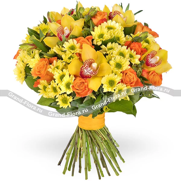 Стандартный: орхидея желтая - 3 шт., роза оранжевая - 7 шт., хризантема кустовая желтая - 5 шт., декоративная зелень, лента.