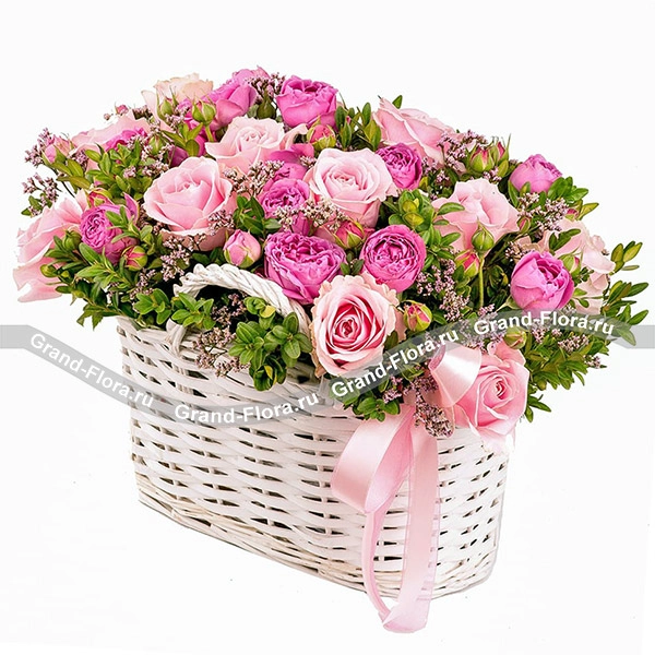 Люкс: роза розовая нежно-розовая- 11 шт., роза кустовая ярко-розовая - 10 шт., декоративная зелень, оазис, лента, корзина. Примерный размер: 25Х25 см.