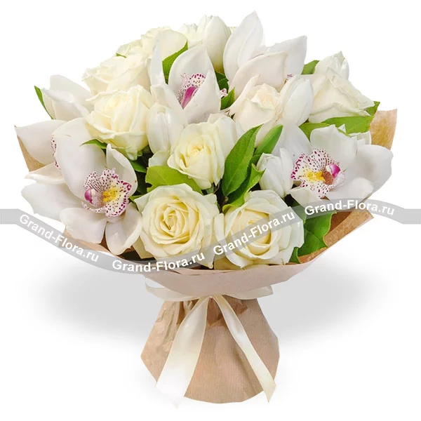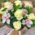 Стандартный:  роза белая - 7 шт., орхидея - 4 шт., декоративная зелень,  упаковка крафт.