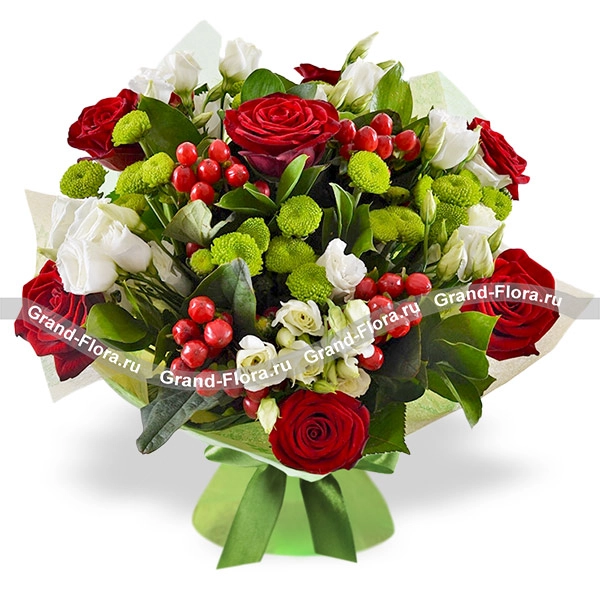 Стандартный: Гиперикум красный (5 шт.), Роза красная (7 шт.), Хризантема зелёная (5 шт.), Эустома белая (5 шт.), Зелень, Упаковка, Лента