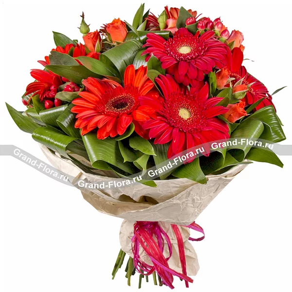 Станрдартный: Гербера красная (7 шт.), Упаковка, Лента, Гиперикум красный (2 шт.), Зелень, Роза кустовая оранжевая (4 шт.)