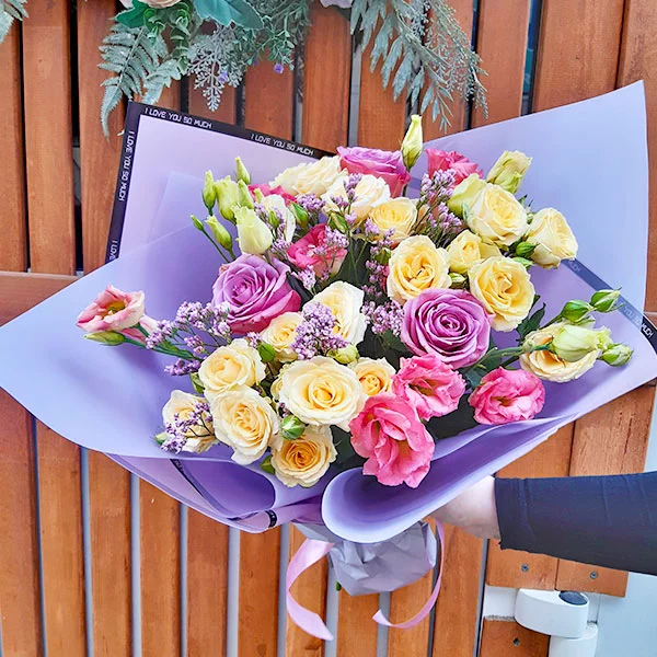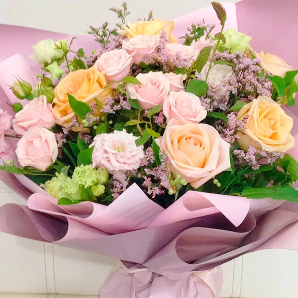 Чарующие и необыкновенные розы сиреневого и кремового оттенка, розовая эустома и фиолетовый лимониум в букете выглядят гармонично, роскошно и привлекательно.