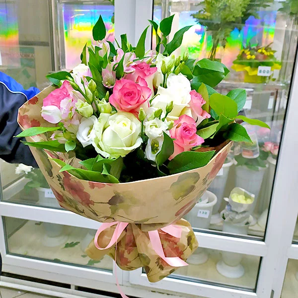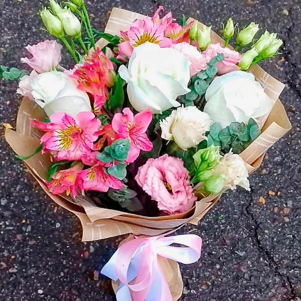 Роза белая- 3шт., эустома розовая – 3шт., альстромерия фиолетовая/розовая –3шт., декоративная зелень (эвкалипт) – 2шт., упаковка,лента.