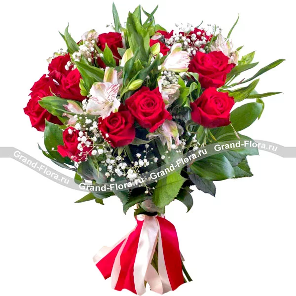 Прекрасный букет! Красные розы — символ страсти и любви, белые альстромерии — нежности и чистоты. Гипсофила и декоративная зелень придают букету воздушность и легкость. Яркий букет получился и не очень дорого по цене за всю услугу. Рекомендую