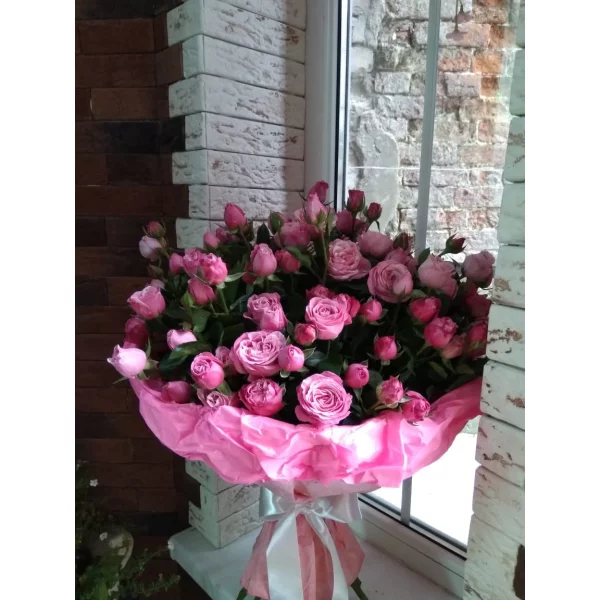 Стандартный: роза кустовая розовая - 9 шт, упаковка, лента розовая. Примерный размер: 25Х25 см.