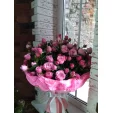 (на фото) роза кустовая розовая - 25 шт, упаковка, лента розовая. Примерный размер: 45Х45 см.