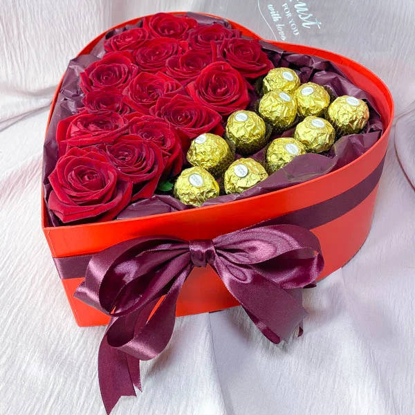 Коробка в форме сердца с наполнением из живых роз и сладостей сочетает в себе все атрибуты подарка, Вам больше не надо искать, что подарить дорогому человек, так как эта композиция отвечает всем требованиям.