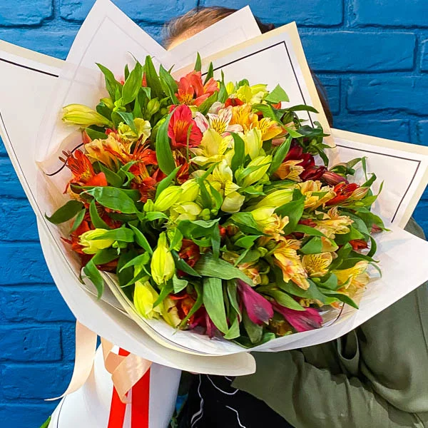 (на фото) альстромерия разноцветная - 25 шт., упаковка крафт или фетр, бант розовый. Примерный диаметр букета 50х50 см.