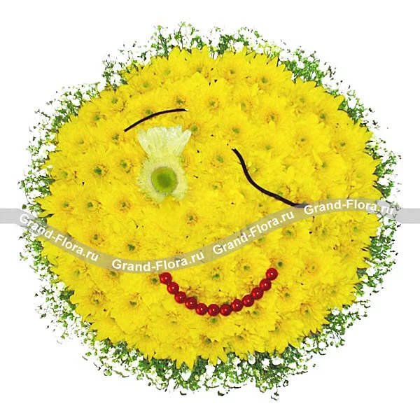 Этот веселый и жизнеутверждающий смайлик подарите тем, кому хотите поднять настроение. Такая яркая и радостная композиция из желтых хризантем вызовет улыбку и не позволит грустить, она покажет, что мир вокруг ярок и прекрасен. Также эта композиция станет прекрасным дополнением к подарку для жизнерадостного человека. В ней он узнает себя: светлого и солнечного.